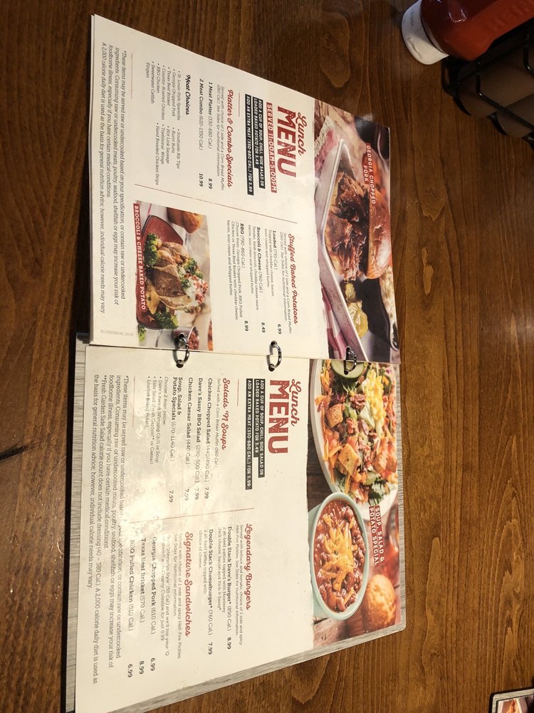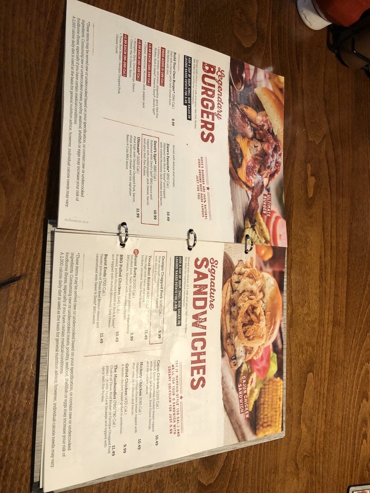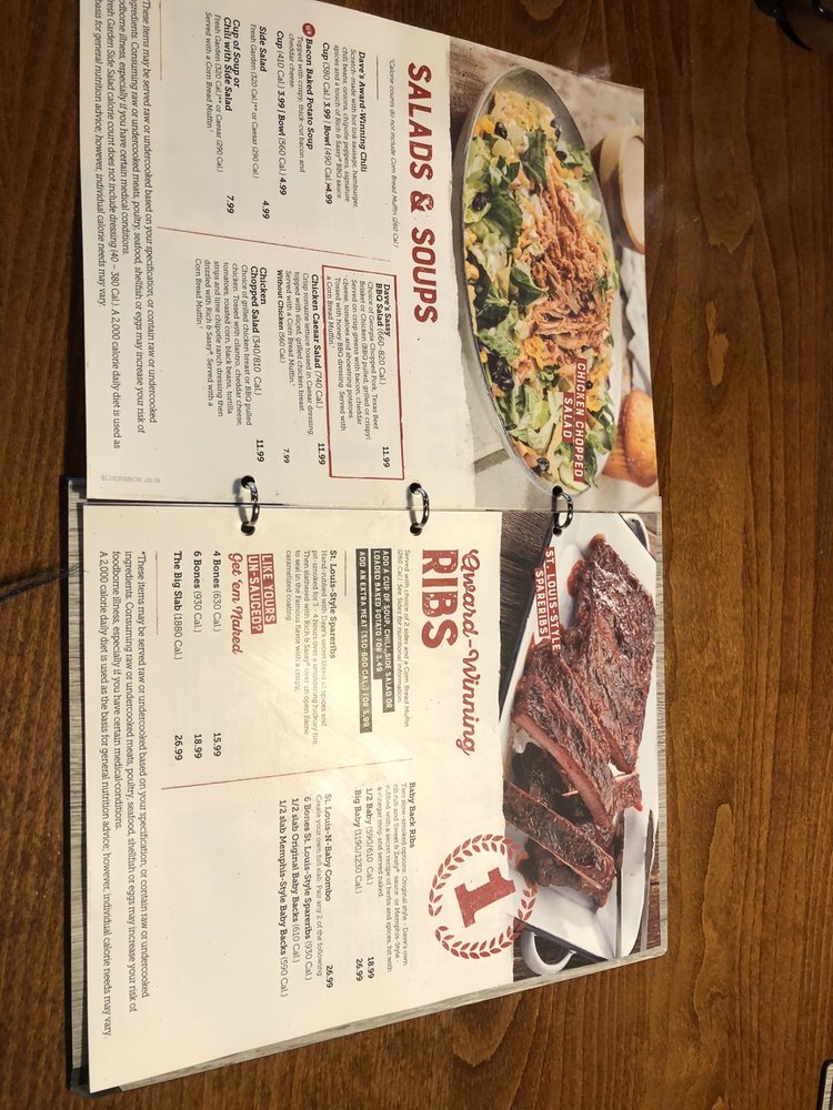 Were halfway there! Half slab of your choice, served with choice of 2 sides 70700 Cal. and a Corn Bread Muffin 260 Cal. St. Louis Style Spareribs Handrubbed with Daves secret blend of special spices and pitsmoked for 34 hours over a smoldering hickory fire. Then slathered with sauce over an open flame to seal in the Famous flavor and give them a crispy, caramelized coating. Like yours unsauced? Order em Naked. Baby Back Ribs Two slowsmoked options Original style Daves own rib rub and Sweet Zesty sauce or MemphisStyle rubbed with a secret recipe of herbs and spices, hit with a vinegar mop and served naked. Not Available on Holidays.