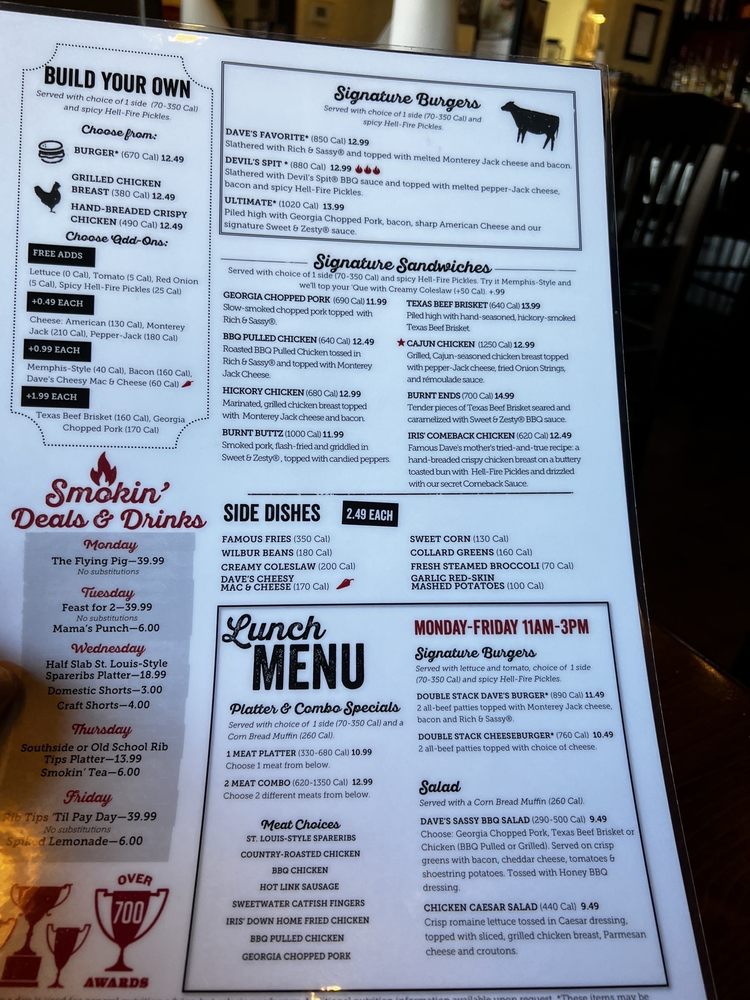 Handrubbed with Daves secret blend of spices and pitsmoked for 34 hours over a smoldering hickory fire. Then slathered with Rich Sassynbspover an open flame to seal in the Famous flavor with a crispy, caramelized coating. Served with choice of 2 sides 70700 Cal. and a Corn Bread Muffin 260 Cal.